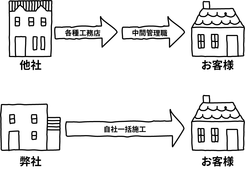 各種工務店、中間管理業者を介さず、直接案件の施工、 職方の管理をさせて頂くことにより、中間マージンが発生しないため、他のハウスメーカー様より約 3 分の 2 程度の費用に抑えることができます。また、大手ハウスメーカーではテレビ CM や住宅展示 場の建設費・維持費など、家の原価とは関係のない販促費まで加算されています。私たちはお客様の ご負担を最大限に抑えるため、広告費や、展示場を持たず同じ予算ならワンランク上の家を提供でき るように知恵と工夫で企業努力をしています。